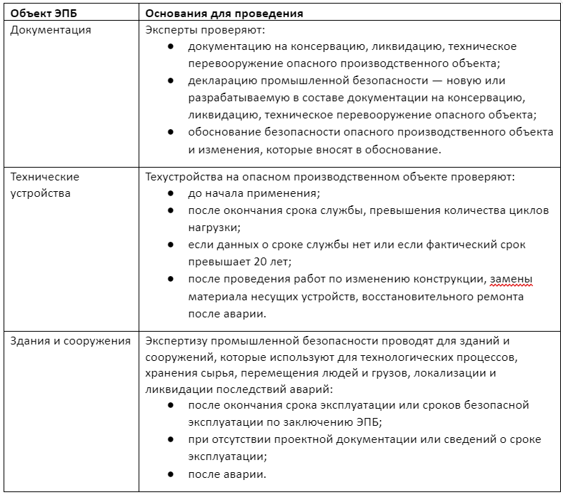 Это технические устройства, используемые на опасных производственных объектах, а также здания, сооружения и техническая документация, связанные с такими объектами. В таблице представлены основные объекты экспертизы промышленной безопасности и причины для ее проведения (ч. 1 ст. 13 Федерального закона №116-ФЗ).